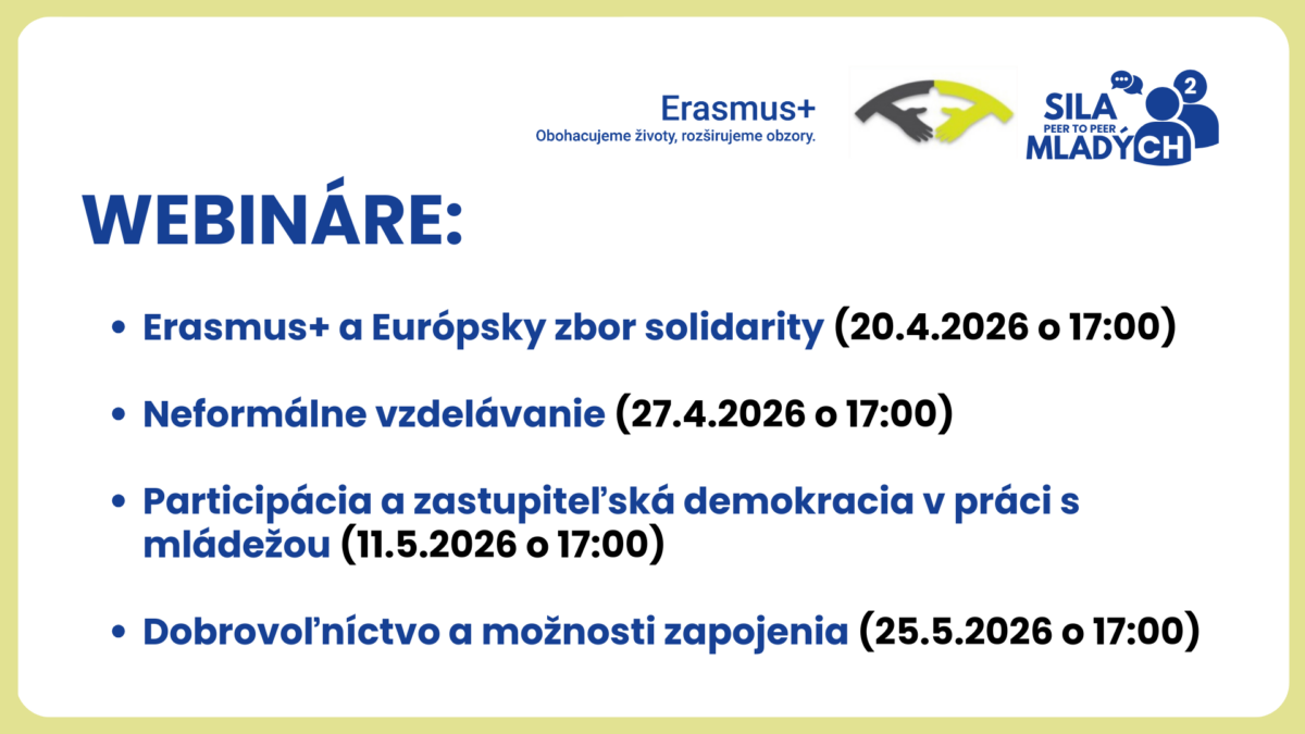 Zapoj sa do interaktívnych webinárov v rámci Erasmus+ projektu Sila mladých 2, kde sa zameriame na praktické zručnosti, osobný rozvoj a možnosti zapojenia mladých.